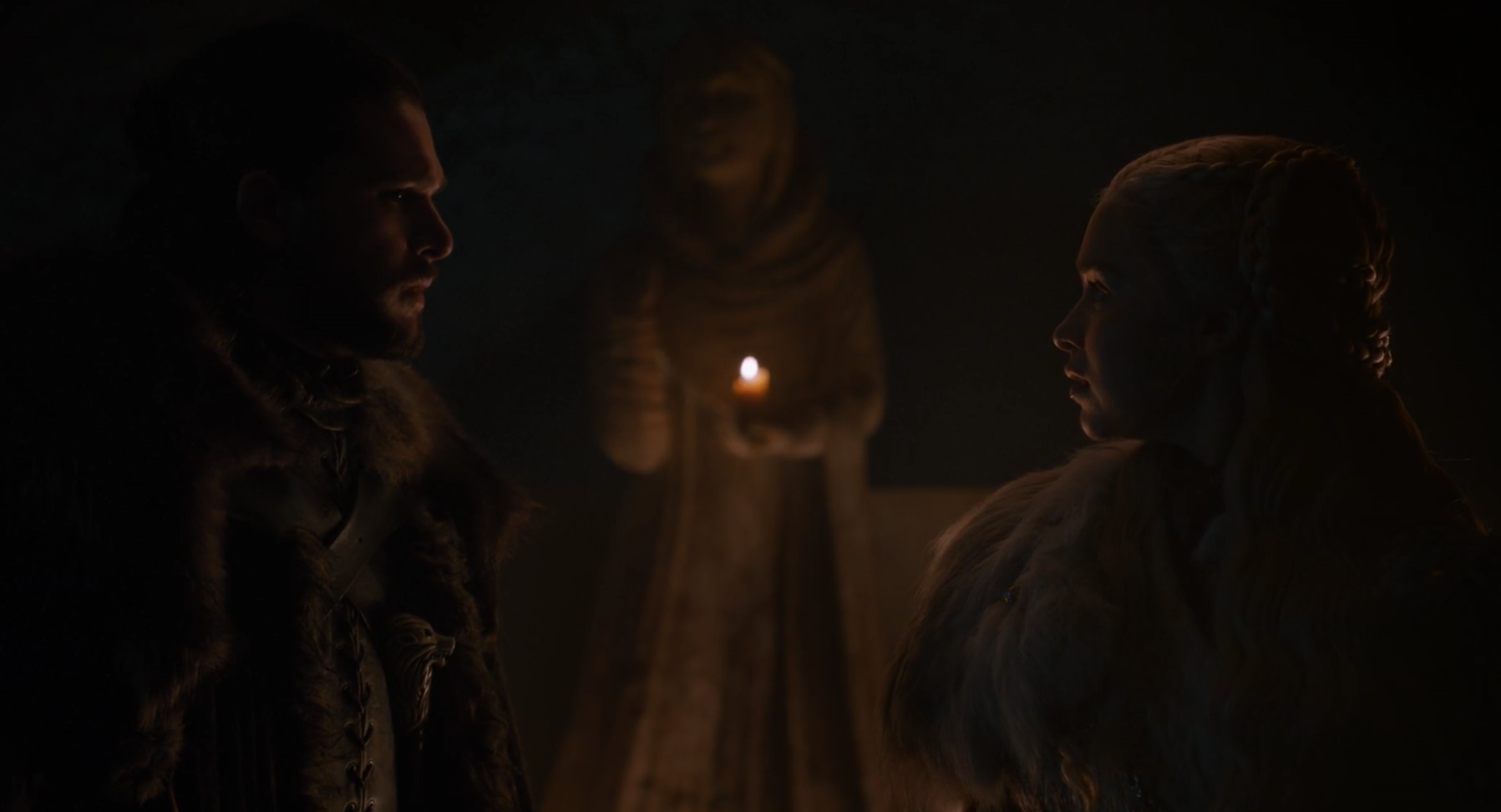 3. The plot really thickens when Sansa and Baelish are in the crypts below Winterfell and Baelish offers up what a very significant piece of history from the timeline before the show started. He tells Sansa about the tourney which took places about 20 years ago, when Rhaegar Targaryen, son of the Mad King and oldest brother of Khaleesi, dueled against Ser Baristan Selmy. After Rhaegar won the duel, he presented Lyana Stark with a bed of roses, choosing Lyana over his own wife, Elia Martell. It is unclear what happened after he declared his affection for Lyana, but Rhaegar and Lyana dissapeared — some say he kidnapped her while others believe she chose to go with him. Robert Baratheon, who loved Lyana and was supposed to marry her, believed that Rhaegar kidnapped her, and used this as justification for Robert’s Rebellion, a war started by he and Ned Stark to get back Lyana…a war that would put an end to the Mad King and the 300 year Targaryen dynasty and land Robert on the Iron Throne. Sure, there were other reasons for Robert’s Rebellion, such as the fact that the Mad King had completely lost his mind and was burning people for fun, or the fact that the Mad King killed Ned Stark’s brother and father. But, ultimately, it was Lyana Stark’s disappearance with Rhaegar Targaryen that would be the catalyst for Robert Rebellion’s. So, we know that when Baelish shares this story with Sansa, it’s extremely significant.