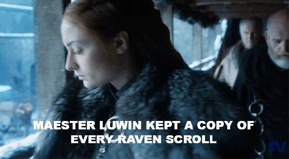 Back in episode three of this season, there was a very brief piece of dialogue, which at the time did not seem important. Maestar Kressen mentioned to Baelish that Maestar Luwin kept a copy of every raven scroll. As a reminder, Maestar Luwin was the original Maestar of Winterfell, serving House Stark for many years, until he was killed by Theon when after he sacked Winterfell. In the third episode of this season, the new Maestar — Meastar Kressen — is telling Baelish that the old Maester Luwin kept a record of every raven scroll that was ever sent to Winterfell (see below).