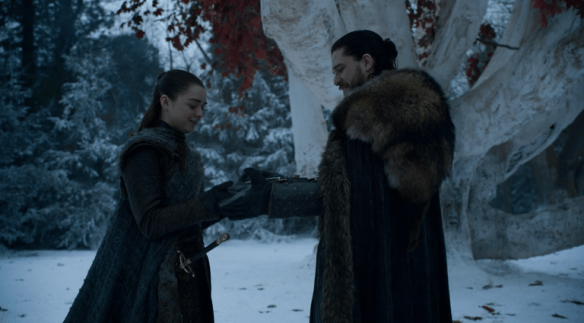 Jon’s reunion with his younger brother, Bran, whom he had not seen in many years, was also nothing to write home about. He wasn’t able to get more than a stoic word or two out of his younger brother. Even his reunion with Sam, his closest friend, was pretty quickly soured by Sam informing Jon that Daenerys had executed Sam’s father and brother. The poor guy, Jon risks it all, only to return home to a temperamental sister, a younger brother that has now turned into a Three-Eyed Raven, and a best friend whose family has been executed by the woman he’s brought into the fold. Not exactly a storybook homecoming. But if there was a silver lining, it was his long-awaited reunion with Arya. Of all the Stark children, Jon and Arya were always the closest, sharing the bond of being the outsiders of the family. Standing beneath the sacred weirwood tree, we are reminded of the Northern blood that runs through their veins, and that in many ways, they are all that’s left of House Stark.