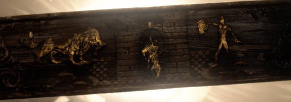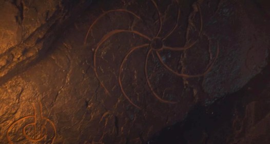 In the image below, we can also see an inscription in the caves below Dragonstone, which Jon discovered last season when mining for dragonglass. He explained to Dany that these inscriptions were made thousands of years ago by The Children of the Forest. One of those inscriptions again shows this very same spiral: