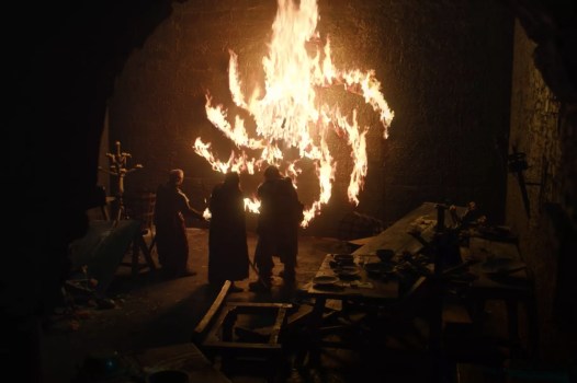 In what was the most entertaining sequence of the episode, Tormund, Beric and several brothers of the Night’s Watch arrive to The Last Hearth to find that The Night King has made mincemeat of whatever humans were at the castle. But before he departed, he left a very clear message, which centered around a symbol we have now seen numerous times throughout the show: the mystery spiral.