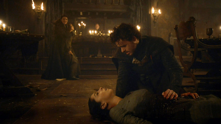 At this same time, Robb Stark learns that Theon has killed his two brothers and burnt Winterfell to the ground. He decides to marry Jayne Westerling, breaking his oath to marry one of Walder Frey’s daughters, and in turn loses the support of his Frey bannermen. As things are falling apart for Robb, he still has Jaime Lannister as prisoner, but he loses that too when his mother, Catelyn, frees Jaime in hope that he will return to King’s Landing and free her daughter, Sansa. Robb decides to return north to free what’s left of his home, but he will once again need passage by the Twins, controlled by House Frey. Lord Walder Frey agrees to allow safe passage if Robb Stark will apologize in person and marry Catelyn’s brother, Edmure Tully, to one of Walder’s daughters. Robb agrees, and after Edmure is married to a Frey daughter, the Freys and the Boltons turn on Robb, killing him, his mother and his direwolf, as well as what was left of his army. The Red Wedding, orchestrated by Lord Tywin, was a momentous betrayal that violated the sacred law of guest right. For his part, Roose Bolton is named overlord of the North, a position held for hundreds of years previously by House Stark.