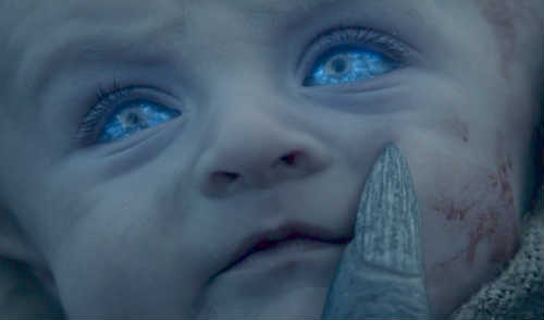But what is more interesting than the eye we analyzed above from the second trailer, is the eye we see in the first one — the one that we see just after seeing that mysterious spiral. The reason this eye perhaps has deeper meaning, is that it looks completely different than the eye of any other White Walker we have seen. Below are a handful of the eyes we have seen, including the human who was turned into the Night King by the Children of the Forest, one of the traditional White Walkers we’ve seen, and the baby we saw the Night King transform into a White Walker. You will notice that all of their eyes are a very deep blue with little beams of light running through them, almost like ripples: