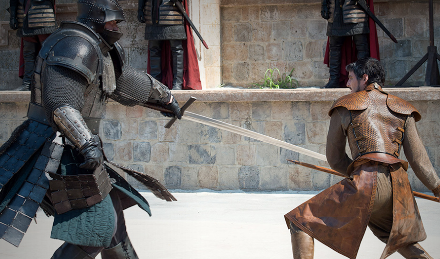 Speed and agility versus size and strength, the trial by combat between the Red Viper and the Mountain finally takes place. While the Red Viper is light on his feet and opts to wear little armor, the Mountain is a gigantic 8-foot monster with a giant sword and massive armor. The Red Viper uses his quickness to dodge many of the Mountain’s blows, and he eventually lands a blow of his own, leaving the Mountain flat on his back. Rather than finishing him off, the Red Viper demands to know who gave the Mountain the order to kill his sister, Elia Martell. As Prince Oberyn looks up at Lord Tywin, the Mountain knocks Oberyn off his feet and gets on top of him, crushing his skull as he admit to the crimes he committed against Elia Martell.